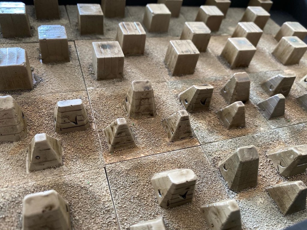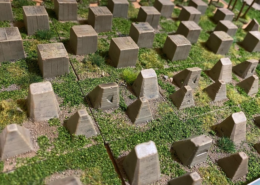 After some obligatory procrastination and several dry-runs on how to place them, I super-glued the dragons teeth to mdf bases. I’ve not yet built the tetrahedrons or Czech hedgehogs.