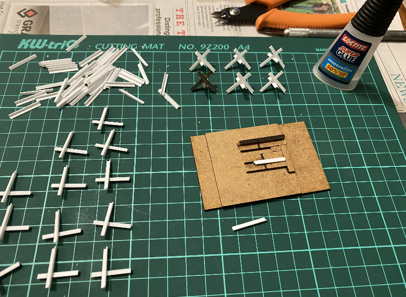 Step 1: Take a strip of your styrene and cut into short 20mm sections. Hot tip, whether you’re using a knife or side cutters ensure you cut each side of the ‘L’ one at a time. Otherwise if you cut in one snip you get a splayed effect. I learnt this the hard way. Once I’d got through one strip I thought there must be a better way of cutting and placing more quickly, so I created a quick jig using mdf bits. Perfect! After some trial and error I was in a good rhythm.