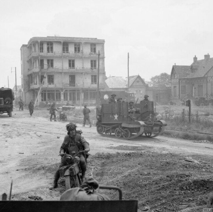 Featured image © IWM B 5038. Description: A Universal Carrier fitted with deep wading screens and motorcyclists of British 3rd Division in La Brèche d’Hermanville, 6 June 1944.