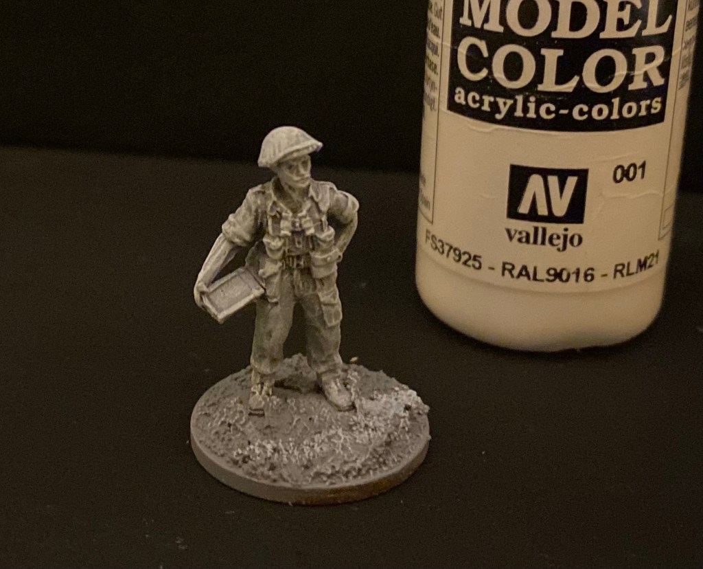 Step 3: White drybrush to the skin areas, and a much lighter dry-brush on the rest of the figure as I know the green paint will be fairy light. I understand the phrase I should be using here is ‘zenithal dry-brushing’.