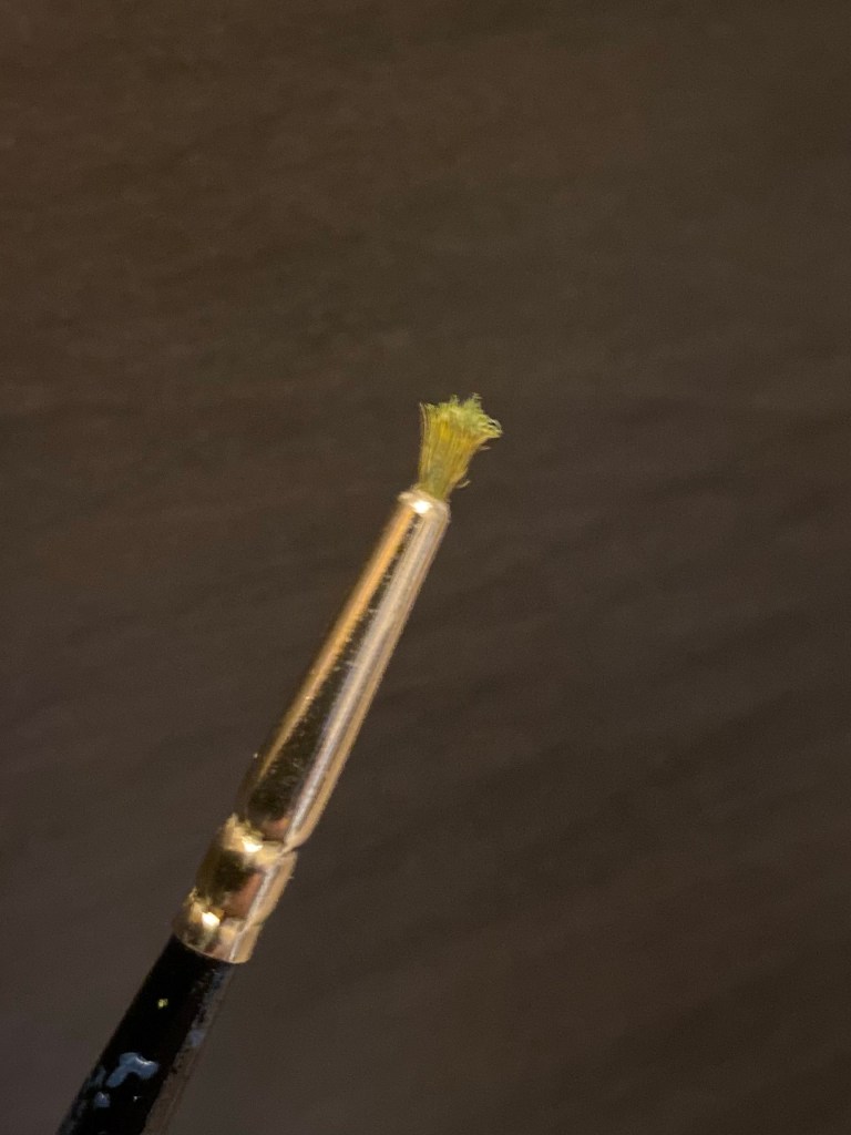 Step 3: Base coat of the SCC15 Vallejo mix. I use an old brush on which I’ve cut down the bristles, which give a fairly hard set of bristles. This one is well used and has feathered, even better!