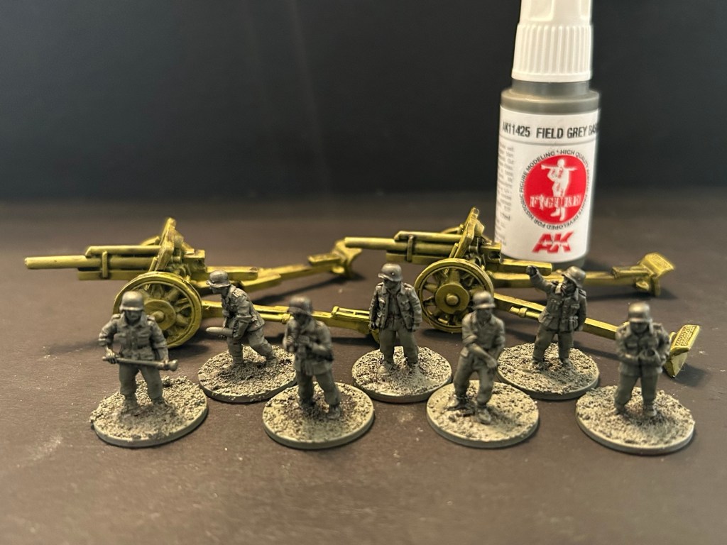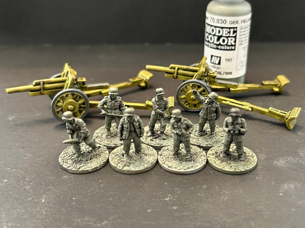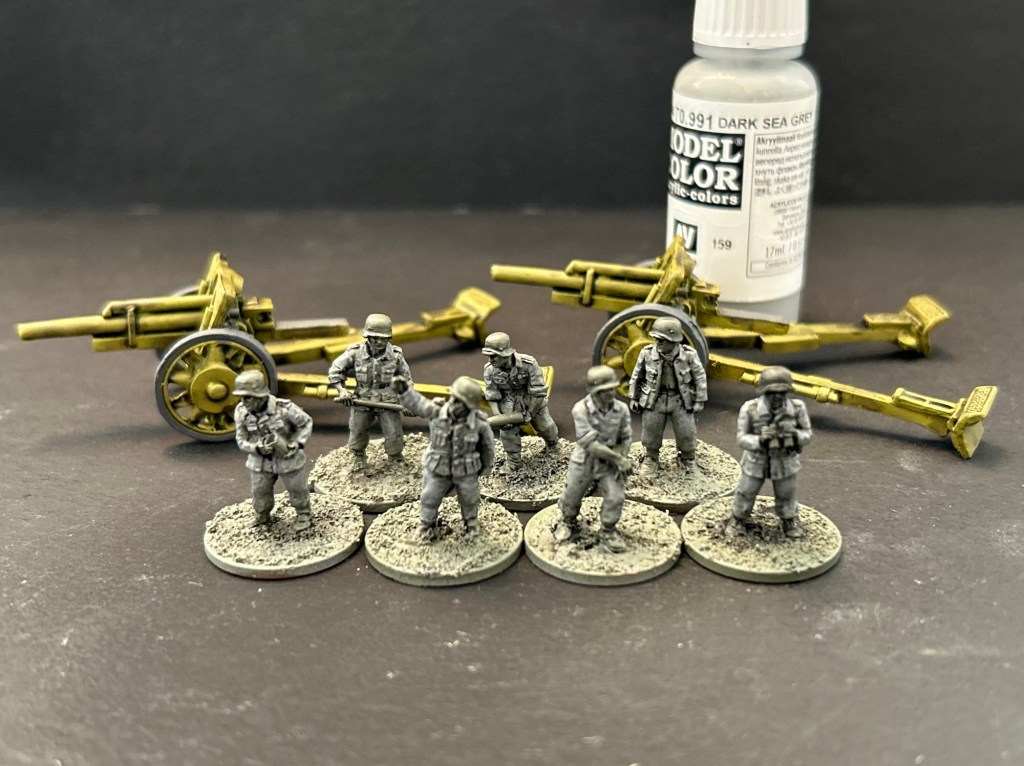 STEP 2: Base coat applied using Plastic Soldier Company rattle-cans. Late War German Dunkelgelb for the guns and German Field Grey for the crew.