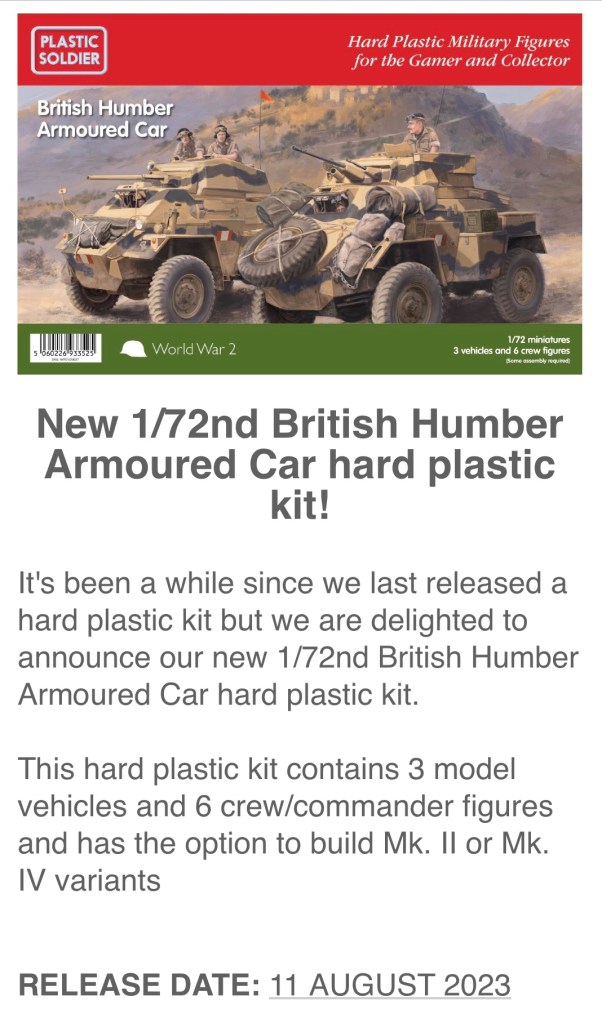 It’s been a while since PSC have last released a hard plastic kit, but great news. Today they have announced their new 1/72nd British Humber Armoured Car kit, following some teasing shots on social media a while ago!